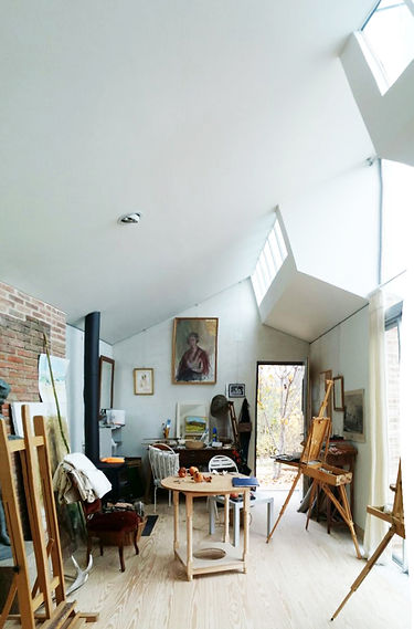Al fondo del jardín de una pintora, apoyado sobre un muro de ladrillo existente, se ha construido este pabellón para servir de estudio. Tres sencillos vanos componen la estructura del pabellón, generando los lucernarios a norte y el ventanal sobre la alberca. El ladrillo de tejar ha sido trabajado con artesanos locales, asi como la cubierta realizada por zingueros de larga tradición. El interior se remata con un suelo de madera de pino soria macizo.